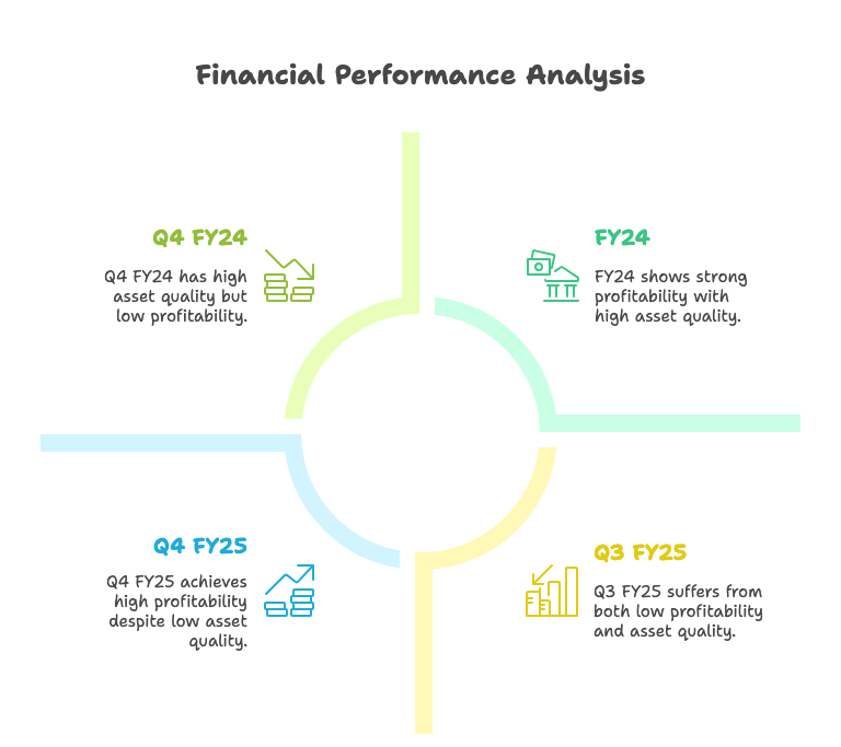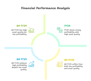 With a Gross Non-Performing Asset (NPA) of 3.99% and a Net NPA of 1.97% as of March 31, 2025, the bank’s asset quality is still stable. The capital adequacy ratio, which stands at 22.98%, is good and provides a strong cushion for future growth.