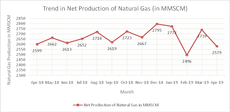 In April 2019, domestic Production of Natural Gas in India was 2579 MMSCM. Domestic production of natural gas witnessed a downfall of 5.8% in April 2019 against March 2019. On YoY, it decreased by 0.7%.